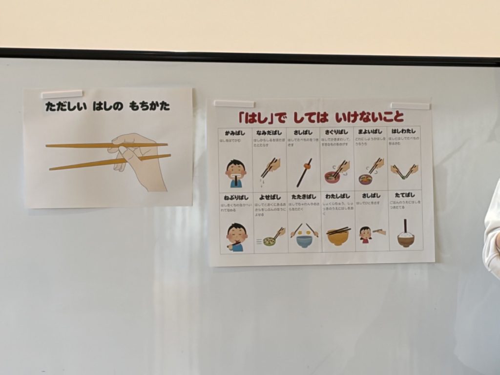味噌玉を作った後は「箸やお椀の持ち方」「箸でしてはいけない事」も教えてもらいました。