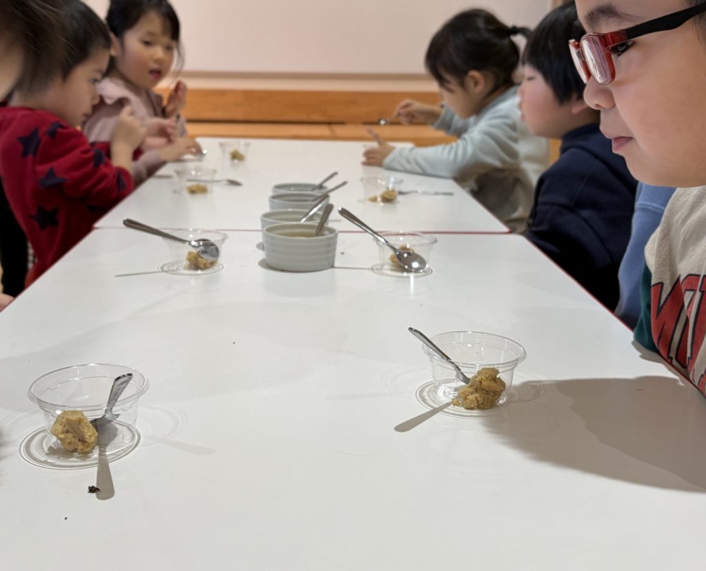給食の時間には各自でお椀に味噌玉を入れました