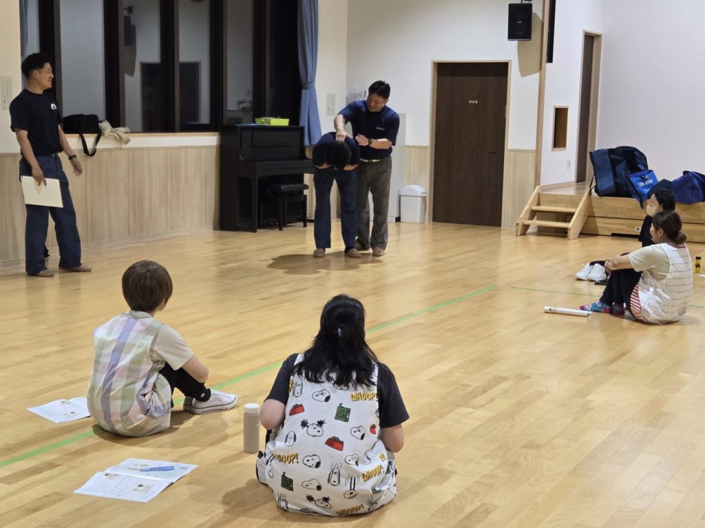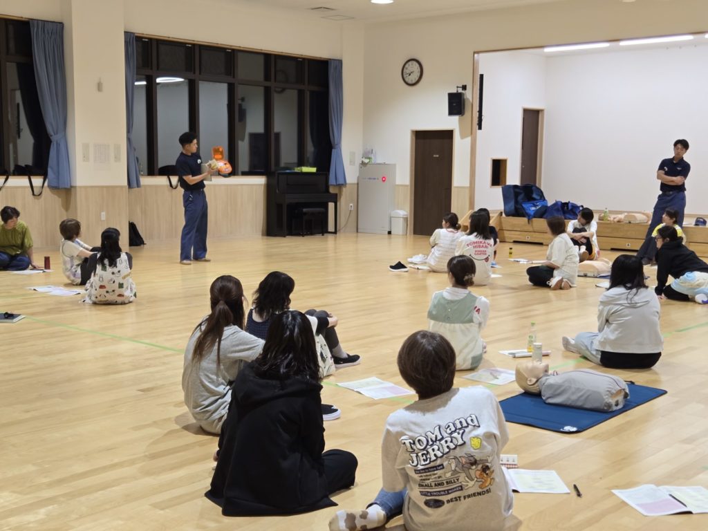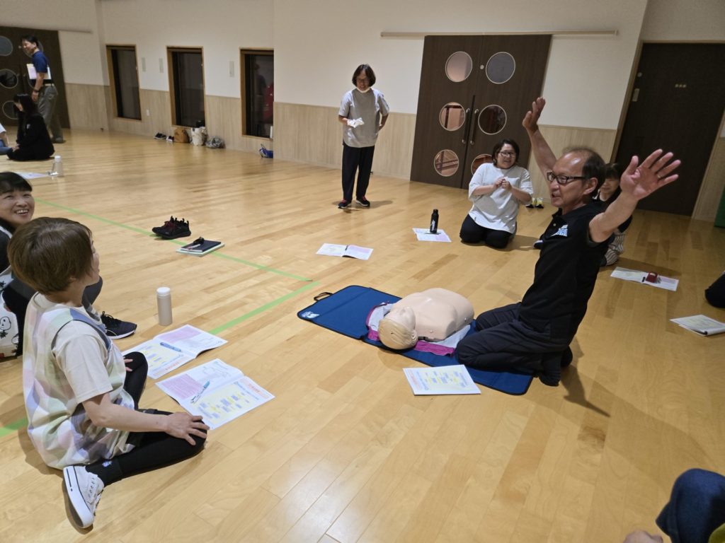 7月17日(木)に富川消防署の方を招いて、救命処置の流れや心臓マッサージ、AEDの使い方、気道遺物の除去方法についての実技講習を行いました。