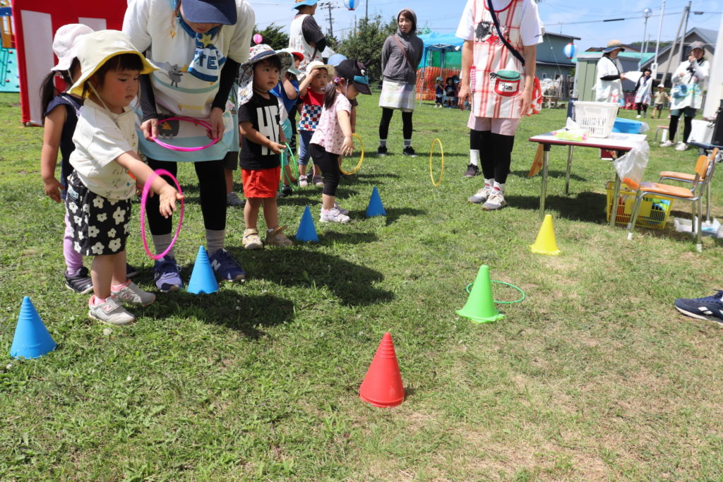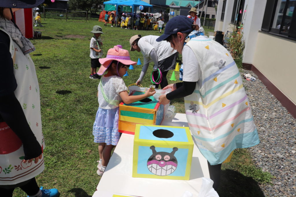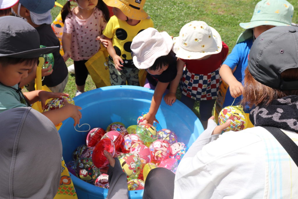 お菓子掴み、ヨーヨー掴み、輪投げにくじ引きと盛りだくさん!たくさんの出店を回った後には、みんなで『ドラえもん音頭』と『子ども盆踊り』を輪になり踊りました。