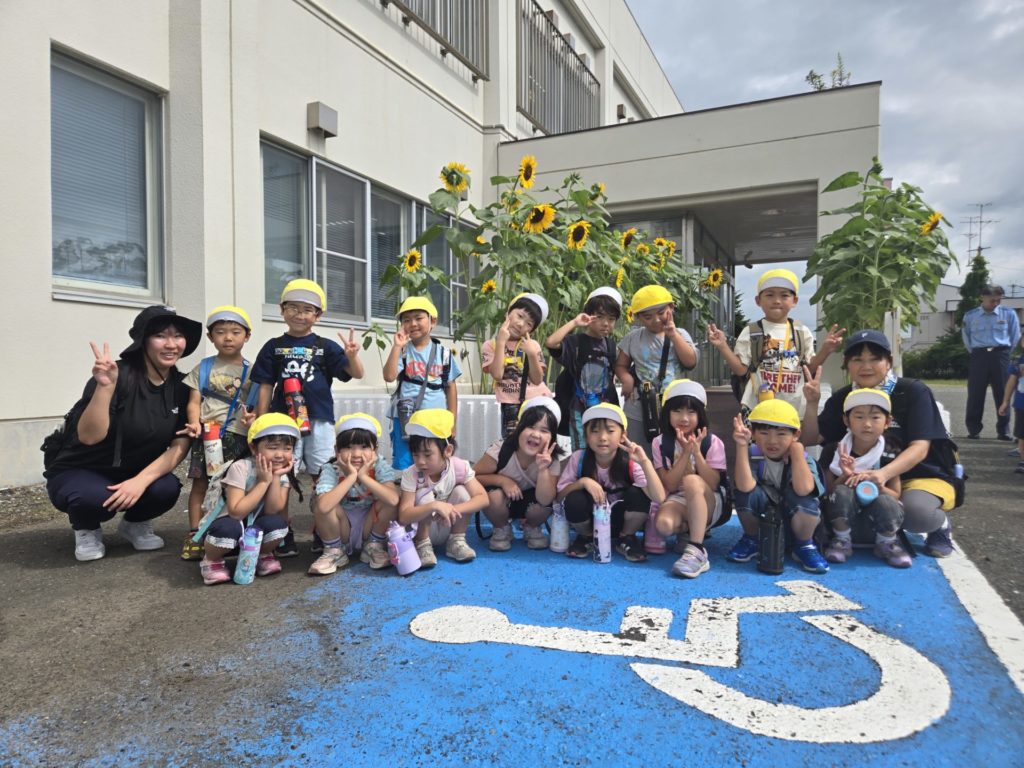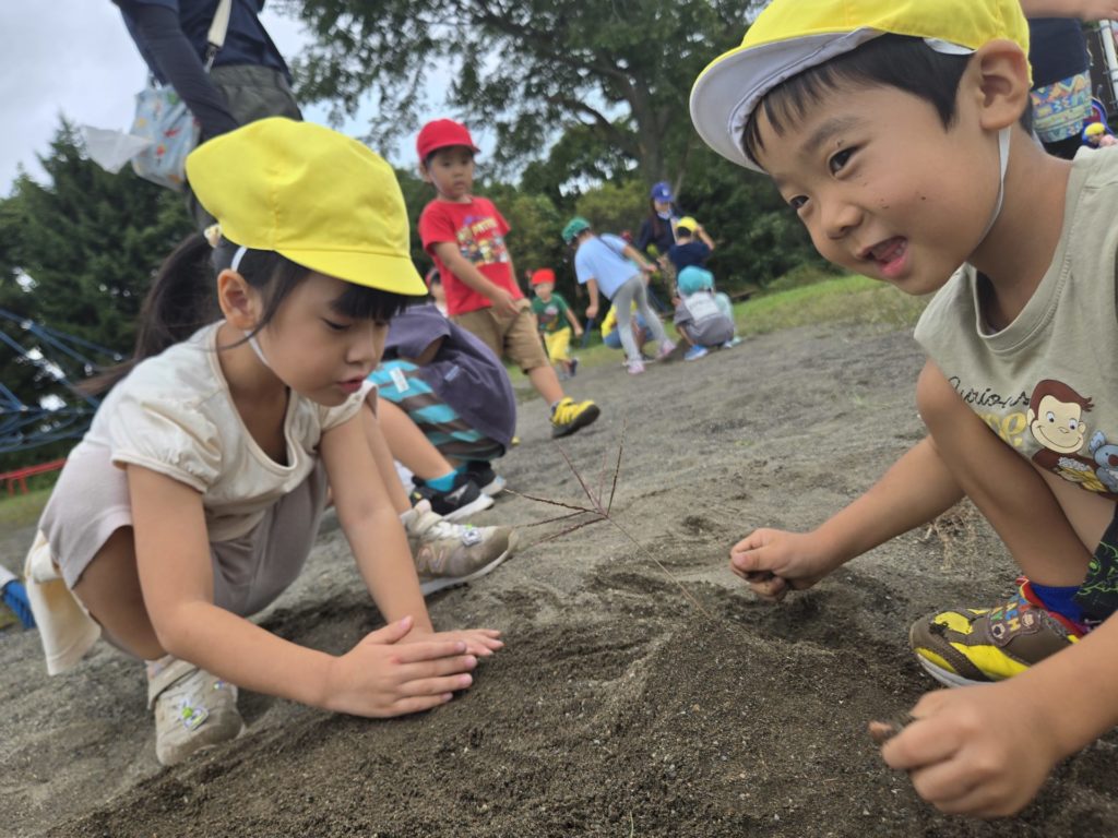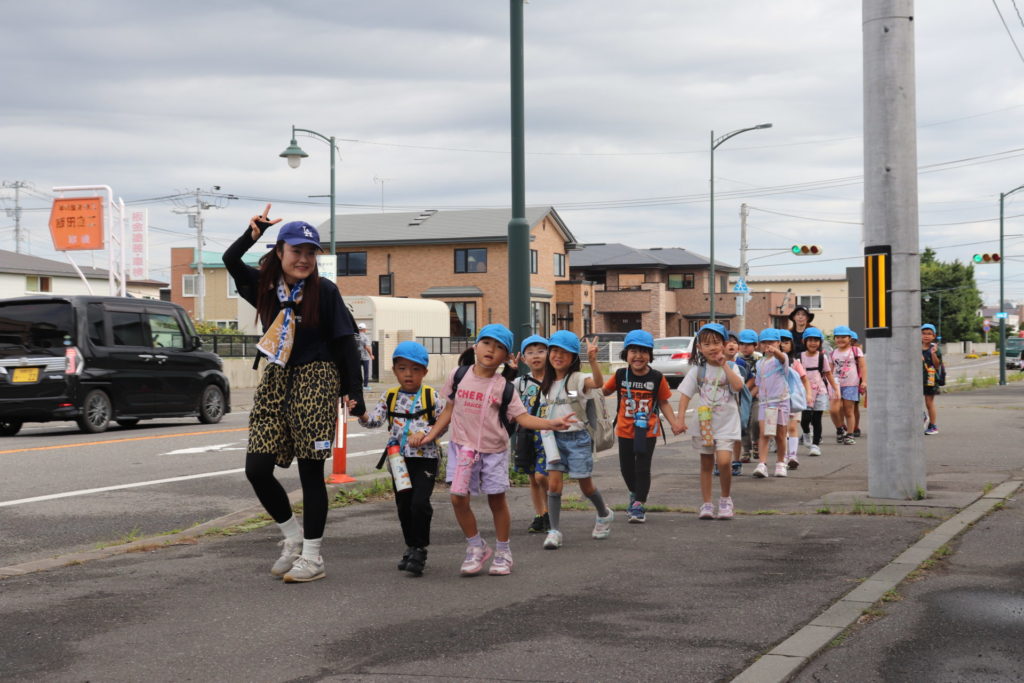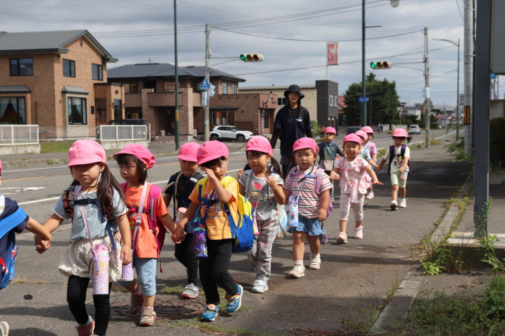 9月5日(金)は遠足でした。朝から天気の心配をして、子ども達が「せんせい、今日遠足行けるよね?」と窓の外を眺めていました。出発時間には雨は降っていませんでしたが、途中何度かポツリポツリ…。そんな微妙な天気でも、子ども達は元気いっぱい!お喋りを楽しんだり歌を唄ったりしながら一生懸命歩きました。