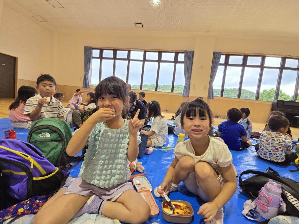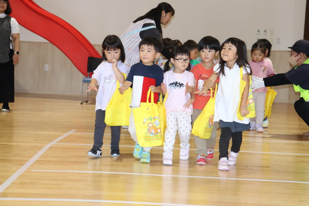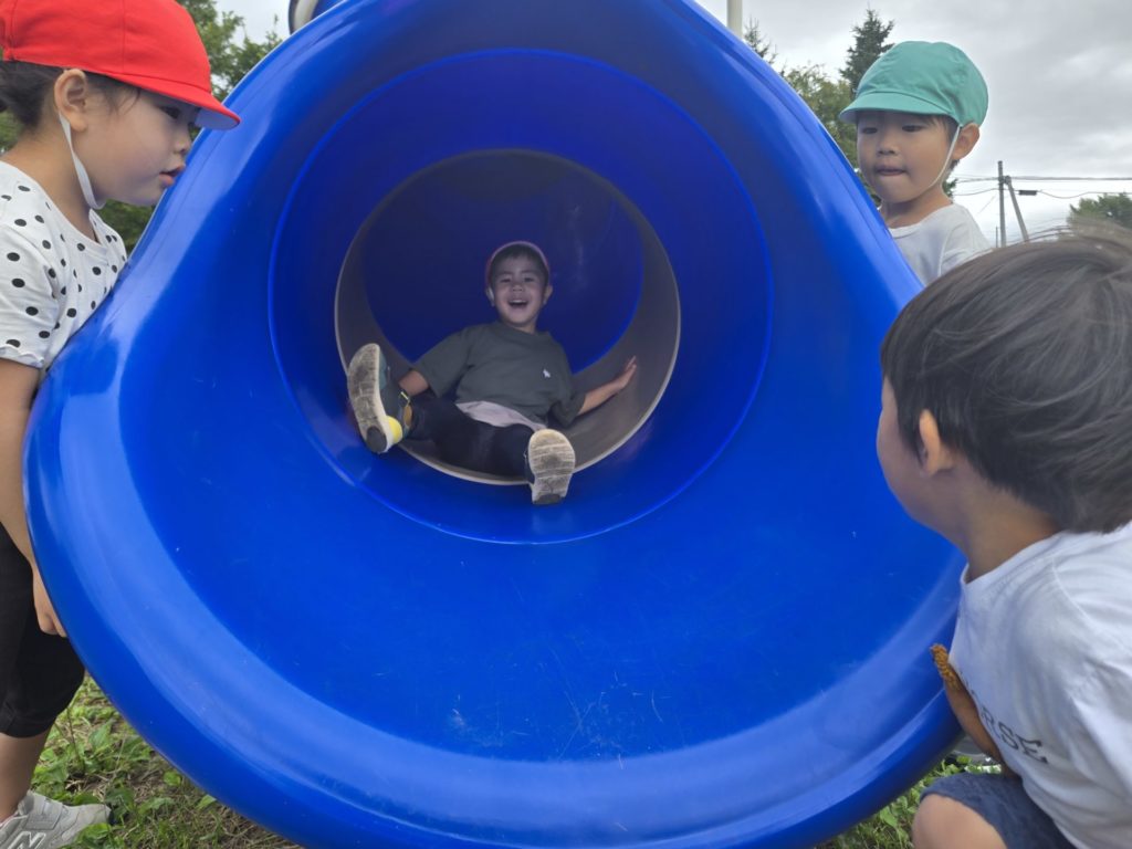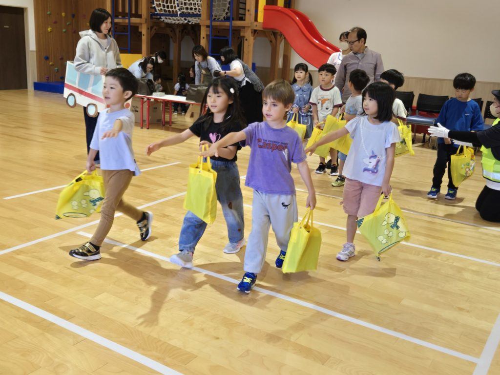 目的地に到着し遊具で遊び始めた頃に、また雨が降り撤収。バスに乗って幼稚園へ帰ってきましたが、おうちの方が作ってくれた美味しいお弁当やおやつを、教室や遊戯室でシートを敷いて食べて、そこでもう少しだけ遠足気分を味わいました。