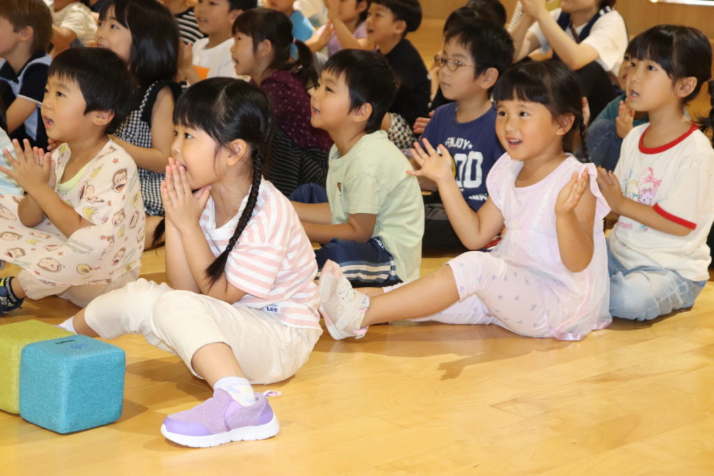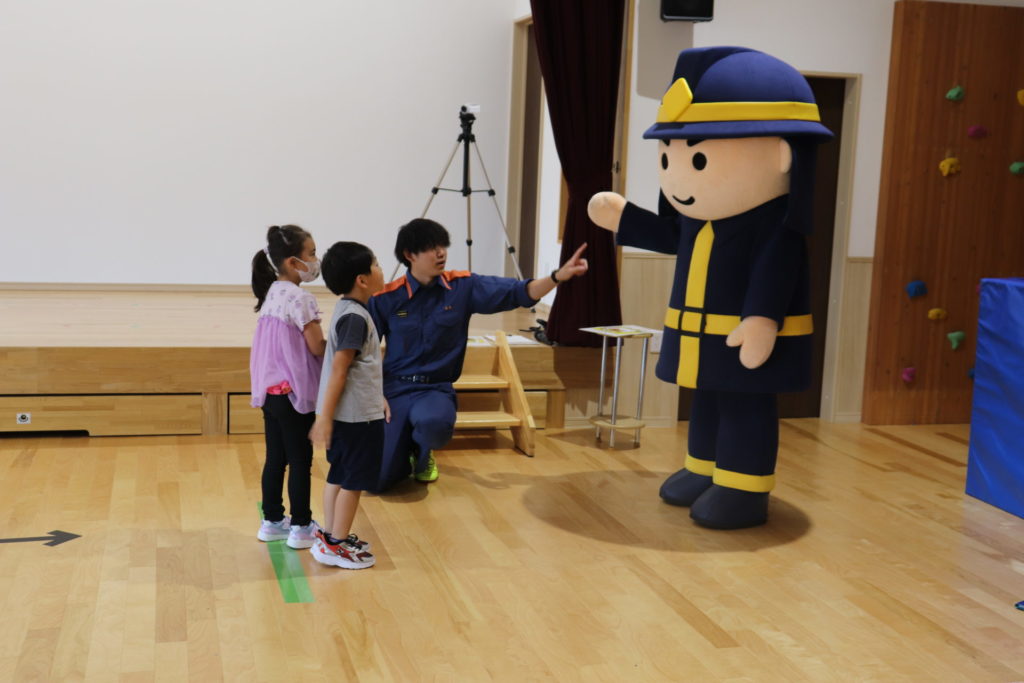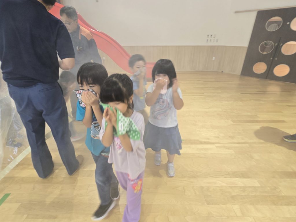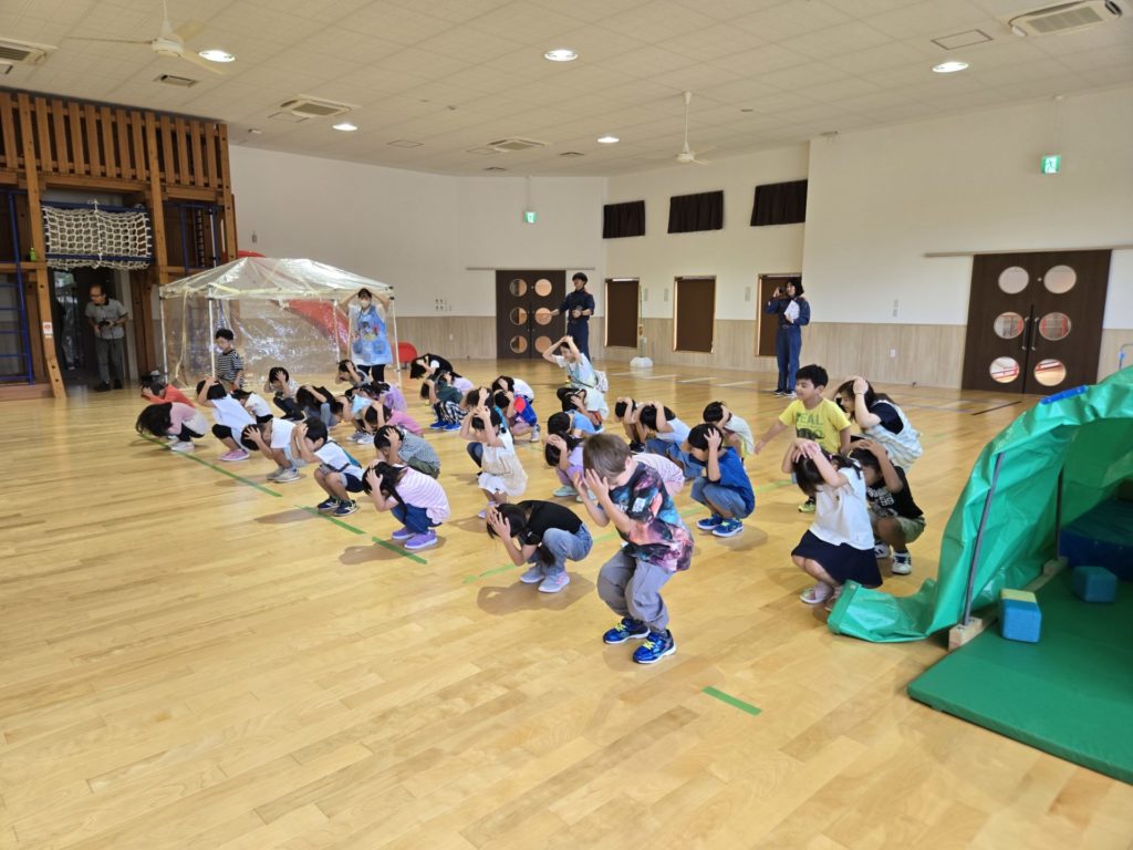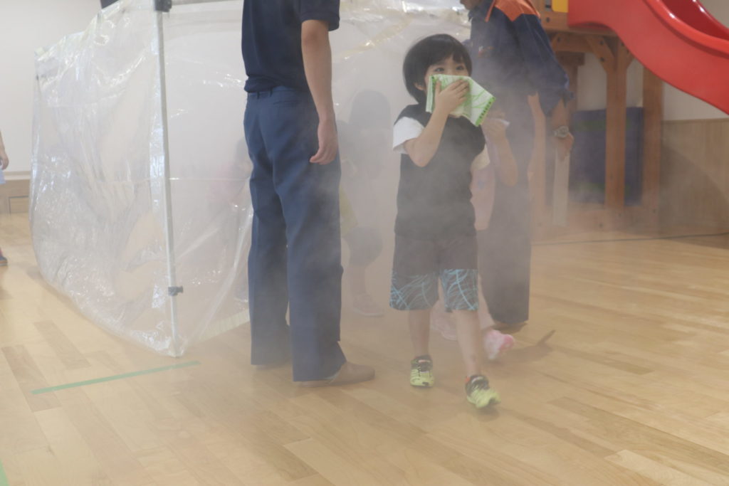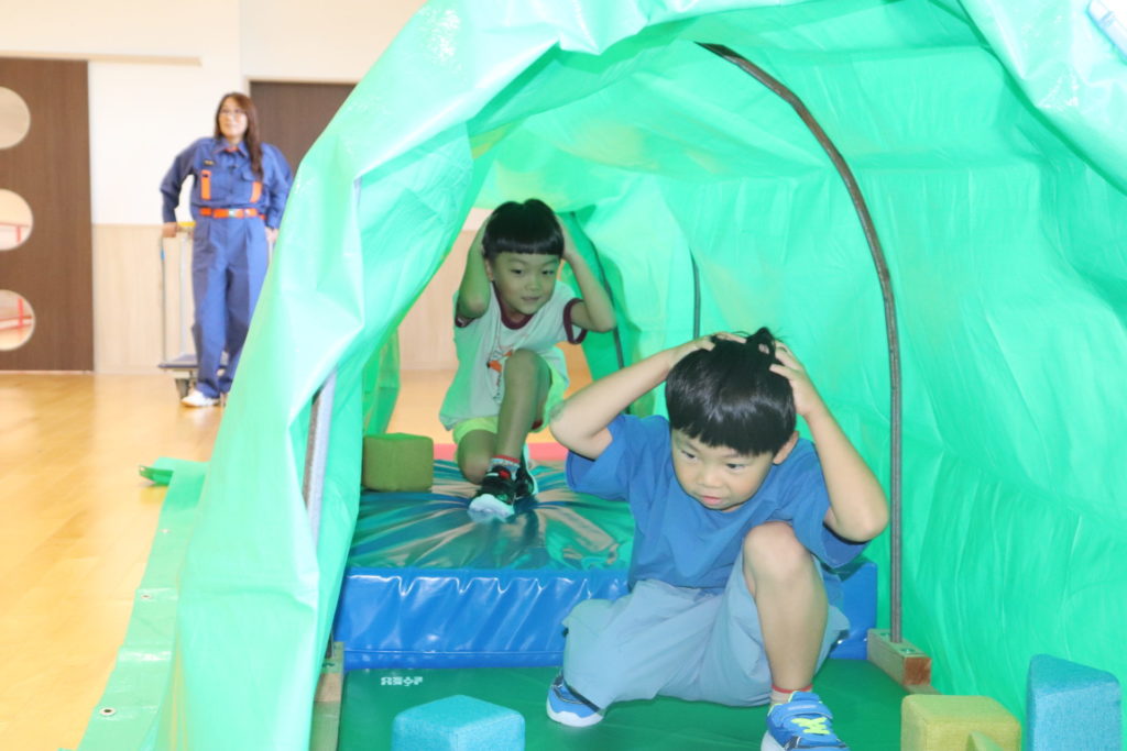 地震の時は「ダック!」、津波の時は「チーター!」とそれぞれの災害時の対処の仕方を、動物に例えた動きで学びました。その後、実際に煙が広がるテントの中を低い姿勢で鼻と口を塞いで通り抜ける訓練や学んだ動きを実践する訓練を行いました。どの子も真剣に取り組んでいましたよ。自分の大切な命を守る術を学んだ、貴重な時間となりました。
