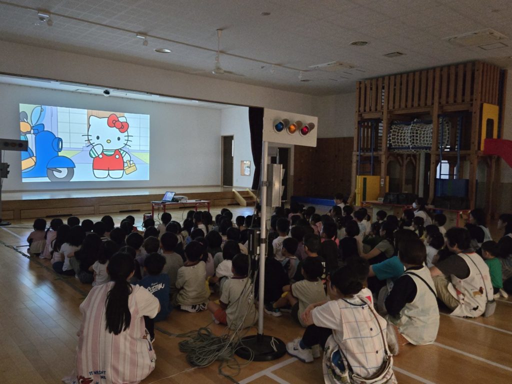 交通安全のDVDをみんなで見た後、遊戯室に設置された横断歩道や信号機を使って道路を渡る実践を行いました。「右、左、右」の確認を繰り返し練習して身につけていく事で、普段のお散歩の際にもより安全に、より楽しく歩けるようになると思います!