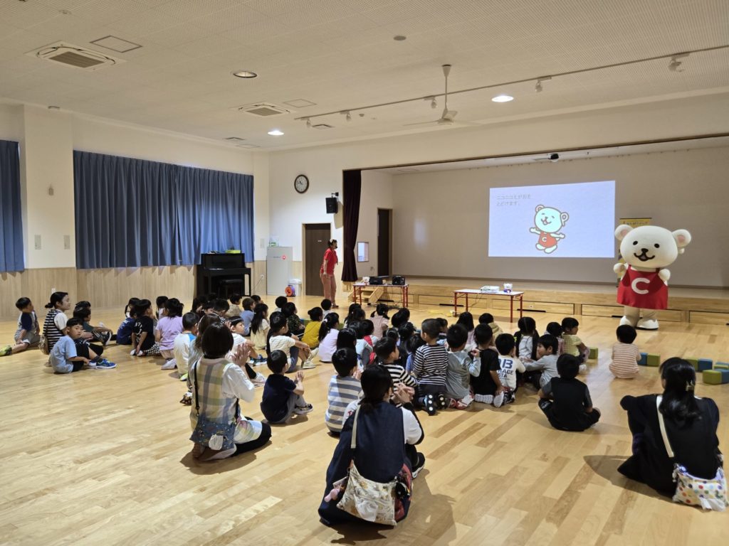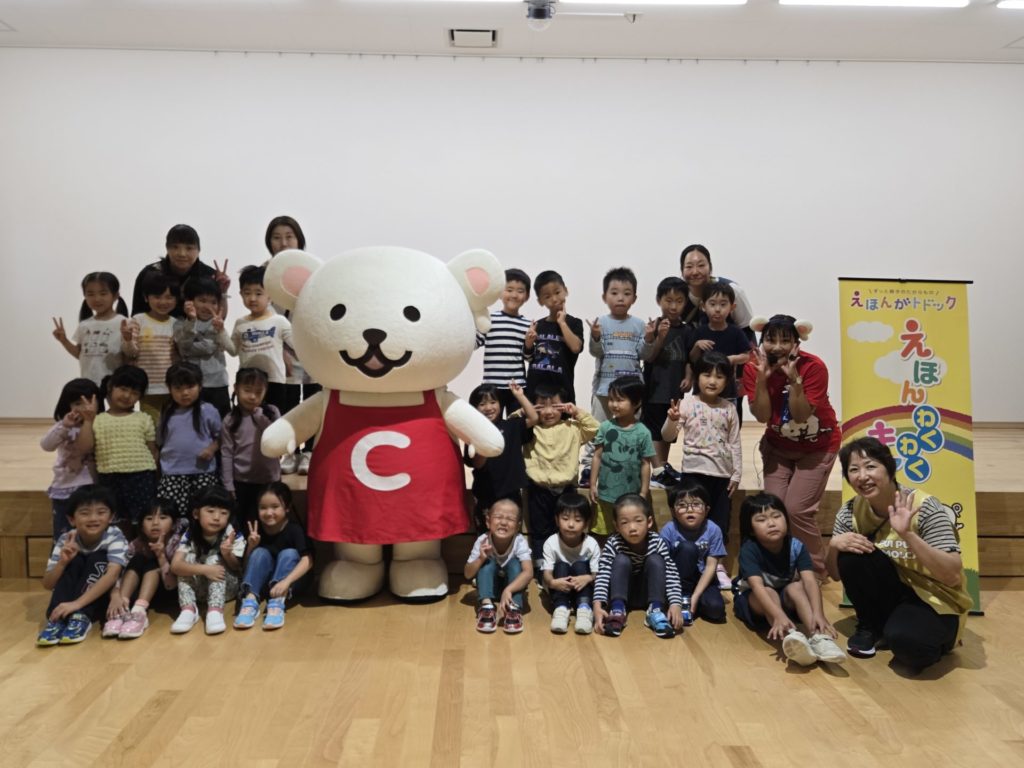 9月24日(金)に『えほんわくわくキャラバン』があり、co-opのトドックが遊びに来てくれました。司会のお姉さんがプロジェクターを使って読み聞かせをしてくれたり、トドックと一緒にトドックダンスや手遊びにと楽しい時間を過ごしました。最後にトドックから絵本のプレゼントがありました!トドックが可愛くて離れがたい子ども達。いつまでも「また来てね~!」と手を振っていました。