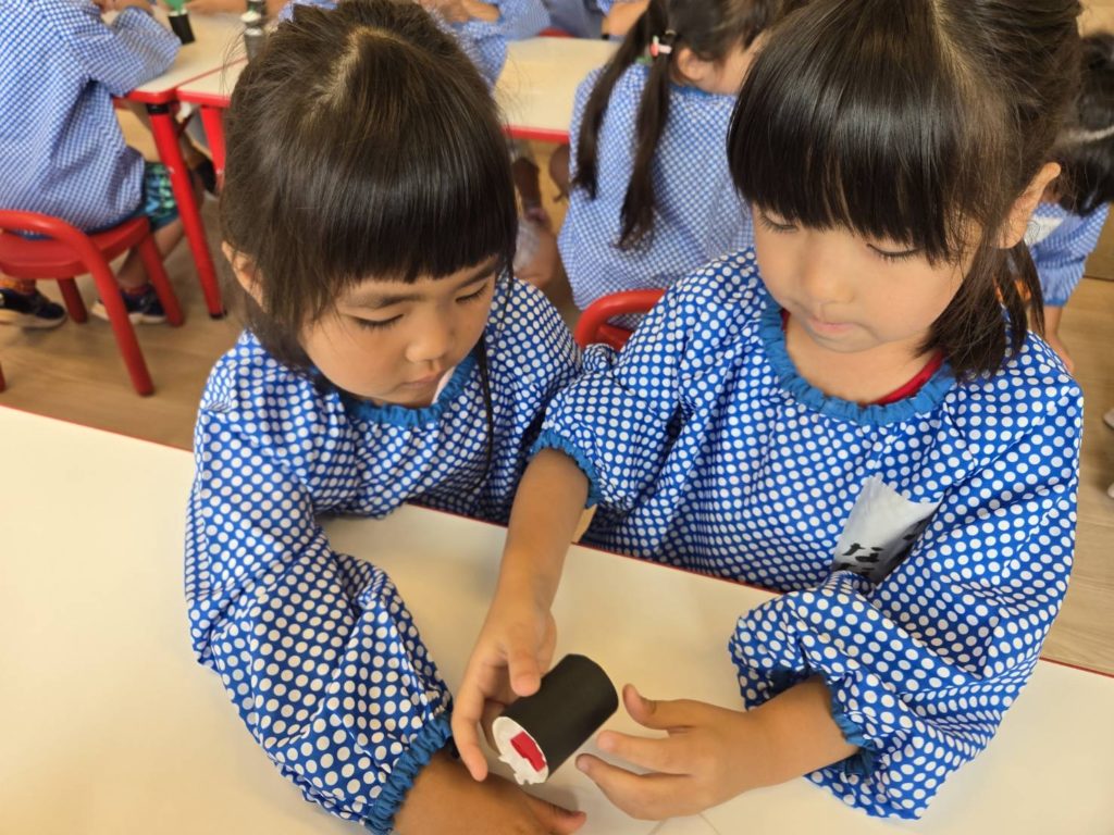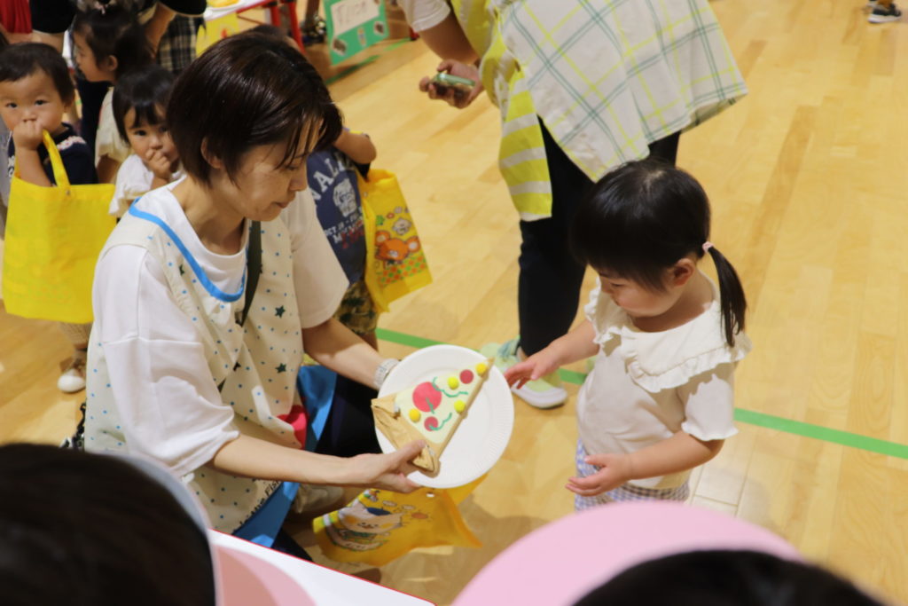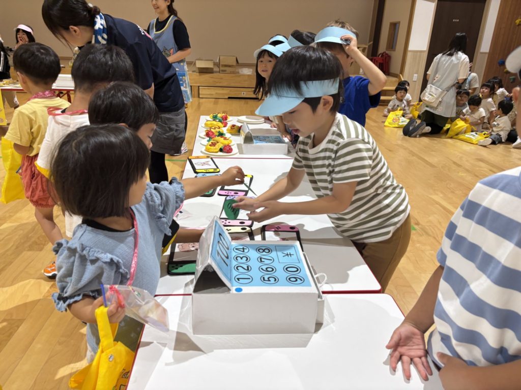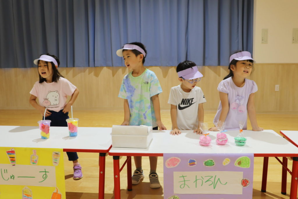 2学期がスタートしてから、以上児クラスが4つの縦割りグループに分かれてこの日のために品物作りに励んできました。今年度は、オムライス・お寿司・ピザ・ホットケーキ・フルーツパフェ・アメリカンドッグ・サンドイッチ・マカロン等の食べ物、キラキラステッキ・スイッチ・パクパク動物・恐竜等の玩具、それから未満児2歳児クラスがトロピカルジュースを作製し、計13種類の品物がお店に並びました。